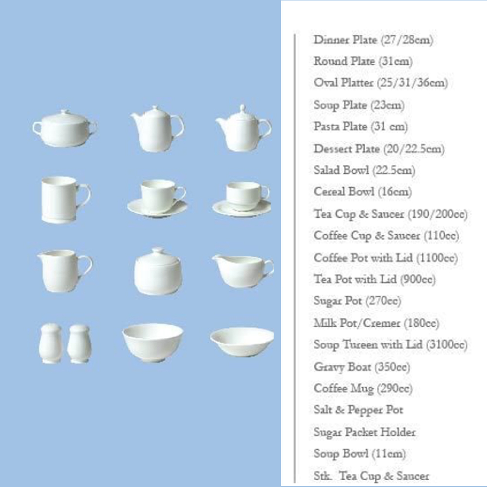 12x Dinner Plates (27cm), 12x Soup Bowls (23cm), 12x Dessert Plates (20cm), 12x Cereal Bowls (16.5cm), 12+12x Tea or Coffee Cups + Plates, 12 Fruit Bowls (14cm), 1x Tea or Coffee Pot, 1x Milk Pot, 1x Sugar Pot, 4x Round Plates (31cm), 2x Oval Platters (36cm), 2x Casserole, 2x Gravy Pot, 3x Salad Bowls (25cm).