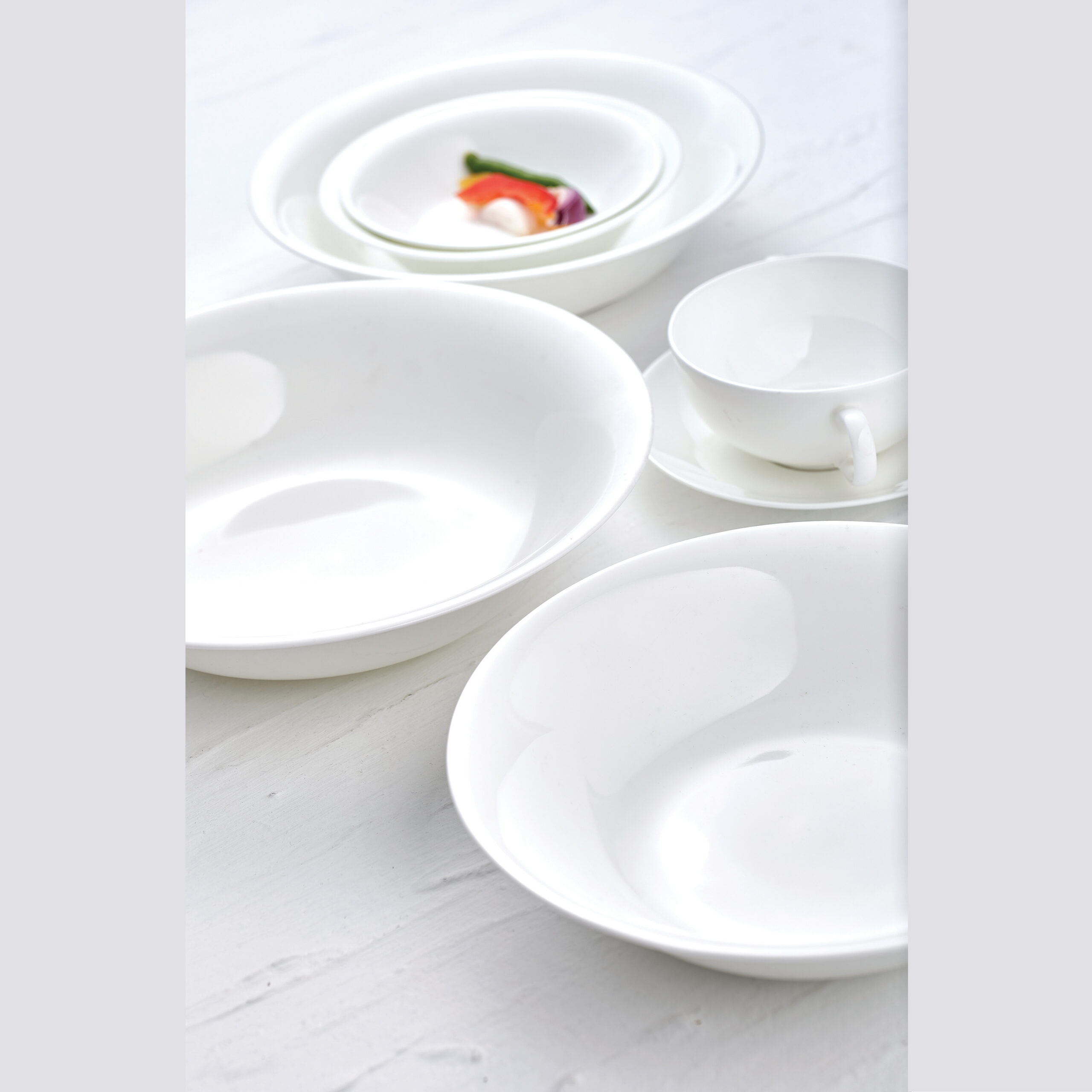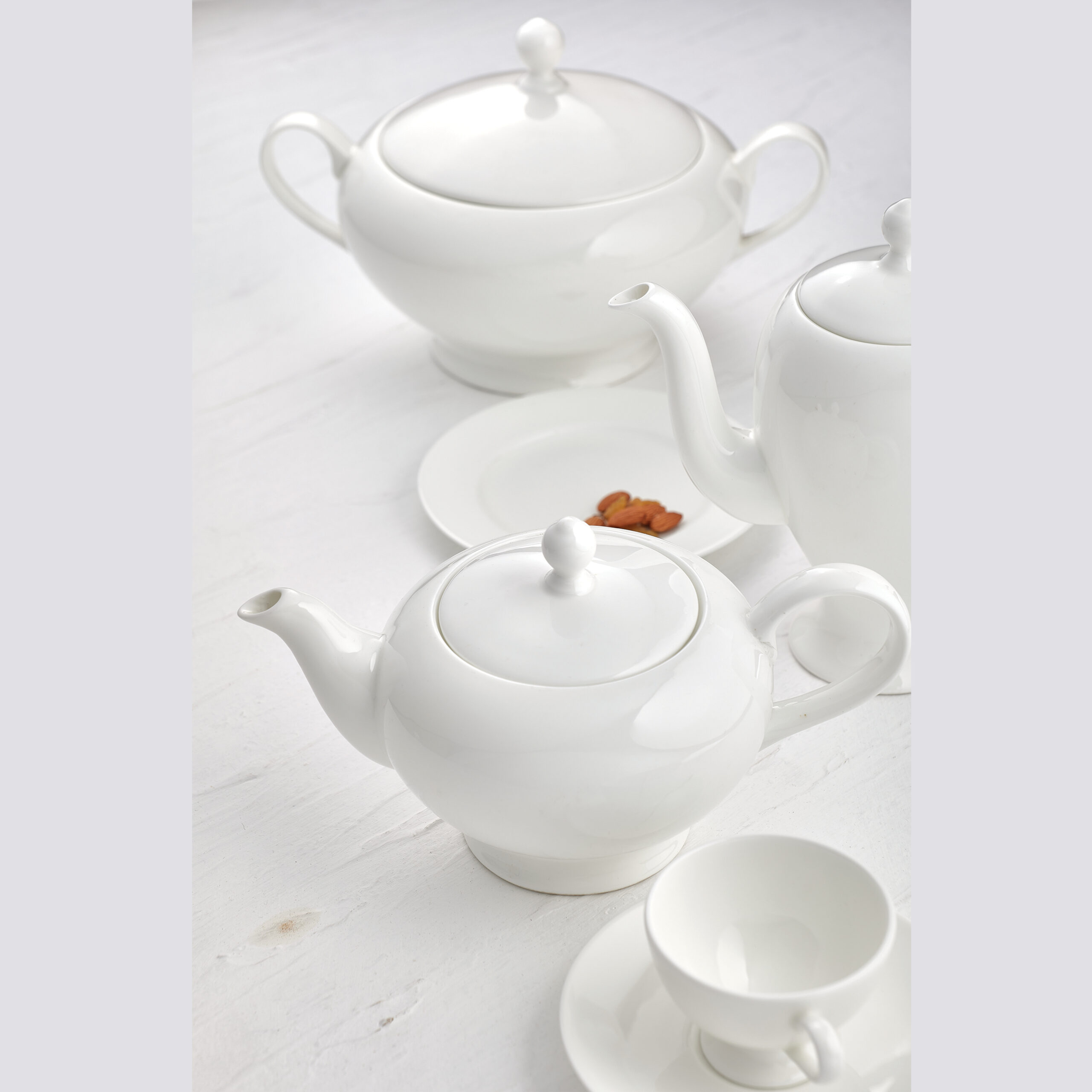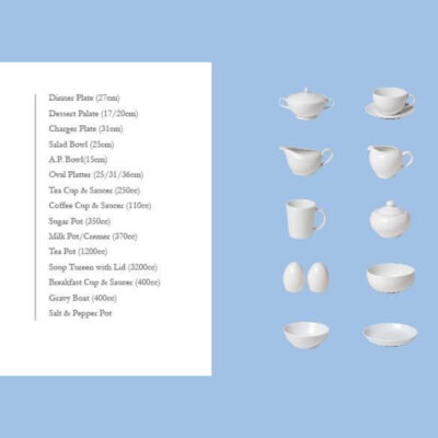 12x Dinner Plates (27cm), 12x Soup Bowls (23cm), 12x Dessert Plates (20cm), 12x Cereal Bowls (16.5cm), 12+12x Tea or Coffee Cups + Plates, 1x Tea or Coffee Pot, 1x Milk Pot, 1x Sugar Pot, 2x Round Plates (31cm), 2x Oval Platters (36cm), 2x Casserole, 2x Salad Bowls (25cm).